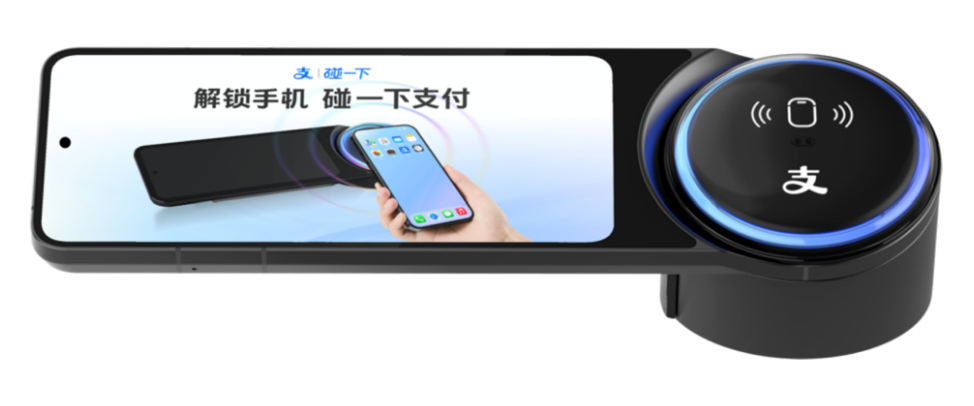 用户无需展示付款码,解锁手机碰一下商家收款设备,一步完成支付